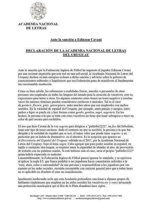 在整个事件中,乌拉圭文学院的反应是至关重要的,他们的职责本就是捍卫本国语言。乌拉圭文学院在公开信中写道:在乌拉圭的兄弟姐妹、亲朋好友之间昵称Gordito(小胖)、Negrito(小黑),被昵称者并不一定是肥胖症患者或者肤色偏黑。卡瓦尼和自己好友之间的用语完全符合这样的情况。